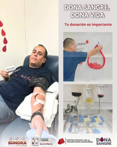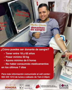 La Secretaría de Salud, a través del Centro Estatal de Transfusión Sanguínea (CETS), invitó a las y los sonorenses a donar sangre de manera altruista y ayudar a quien lo necesita, acto que beneficia a mantener los bancos de sangre con reservas.