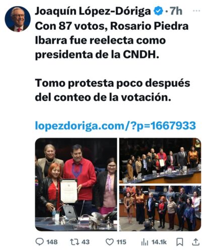 A propósito, me reportan que Valles Sampedro fue de las integrantes del Senado de México que mejor entonada estuvo durante la madrugada de ayer, haciendo un break en la sesión donde impusieron la reelección de Rosario Piedra Ibarra al frente de la Comisión Nacional de Derechos Humanos (CNDH), a la hora de cantarle “las mañanitas” al ex presidente, López Obrador con motivo de su cumpleaños número 71.