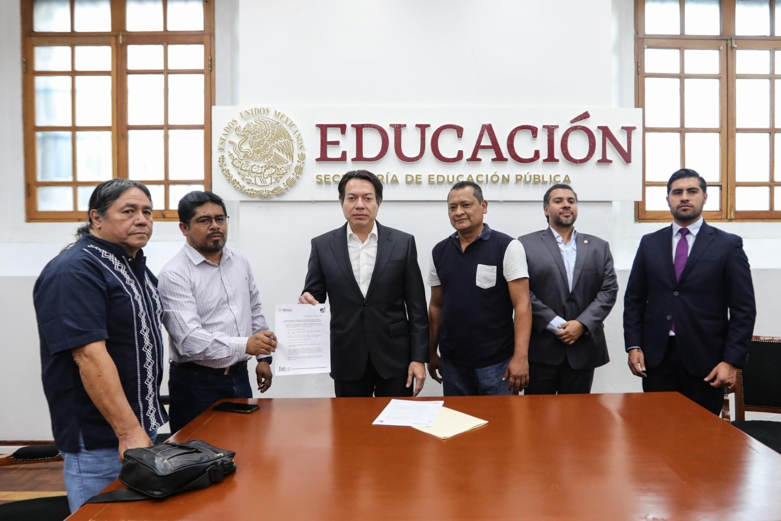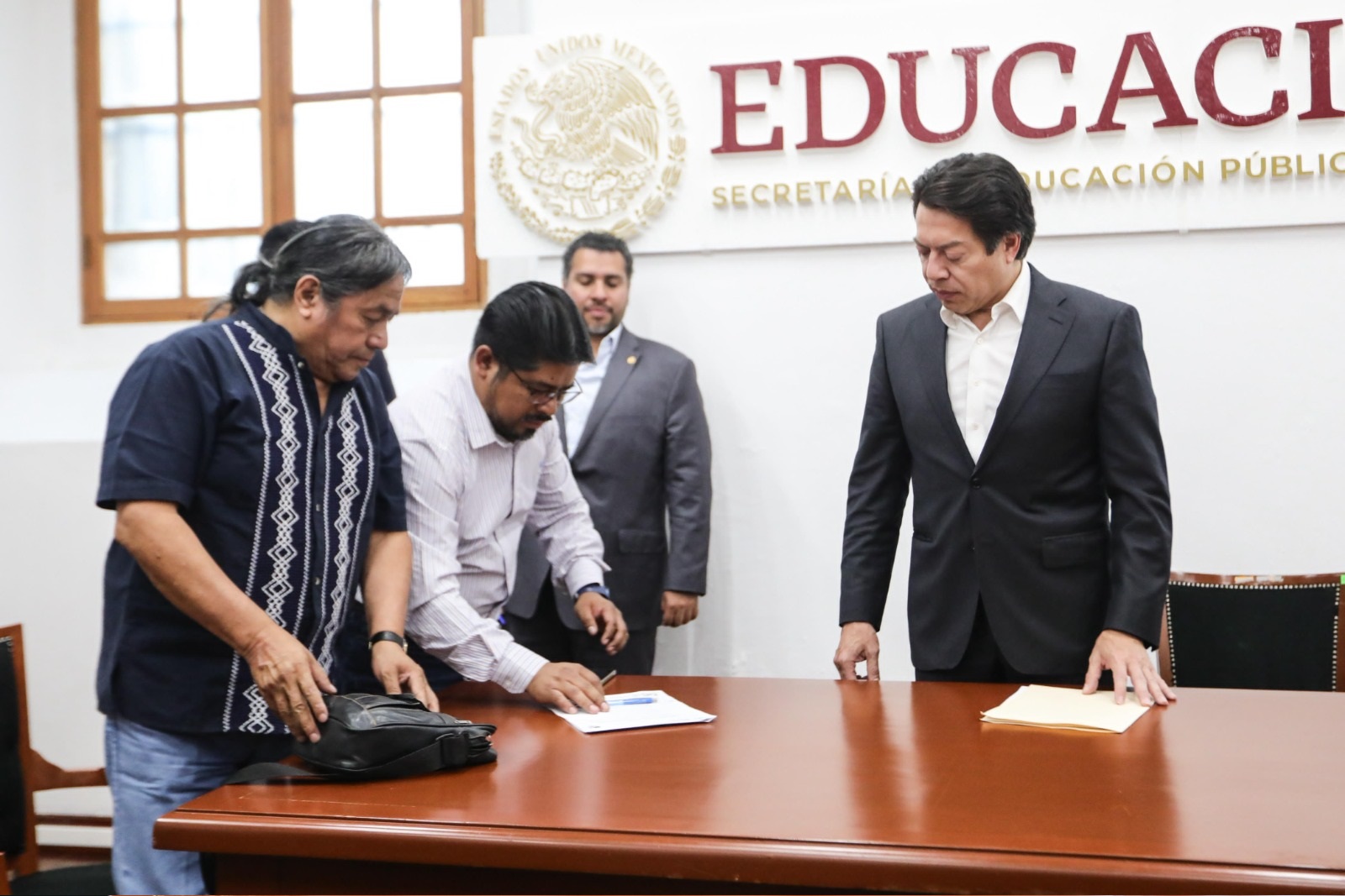 El secretario de Educación Pública, Mario Delgado Carrillo, entregó la propuesta de la Presidenta Claudia Sheinbaum Pardo para todas las maestras y maestros del país, a los representantes de la Comisión Nacional Única de Negociación (CNUN), que presentó esta mañana durante la reunión con la Coordinadora Nacional de Trabajadores de la Educación (CNTE) en Palacio Nacional.