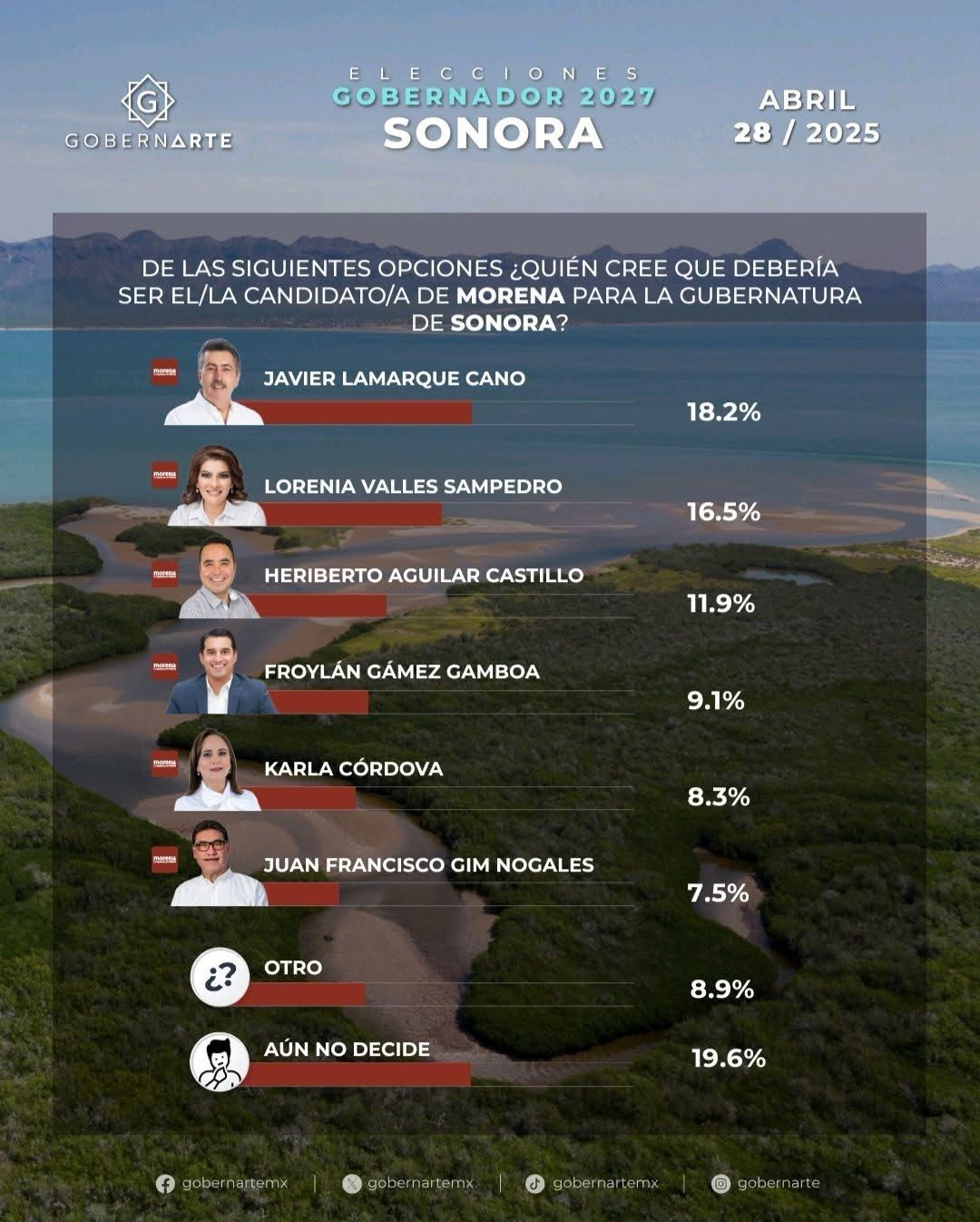 ¿Y a qué ni sabe quién aparece como el mayormente mencionado para dicha candidatura?, pues claro, el mismísimo Javier Lamarque, haciendo morder el polvo al resto de los sonantes, como son la dupla en el Senado compuesta por Lorenia Iveth Valles Sampedro y Heriberto Marcelo Aguilar Castillo; el secretario de Educación y Cultura, Froylán Gámez Gamboa; la alcaldesa de Guaymas, Karla Córdova González; el alcalde de Nogales, Juan Francisco Gim Nogales, así como a cualquier otro.