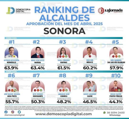 Digo, no por nada es que la doctora Karla Córdova está rankeada en un lugar preferencial dentro de los alcaldes y alcaldesas sonorenses mejor evaluados por sus gobernados, y de ahí que sea ella también una de las cartas fuertes de Morena para la candidatura a la gubernatura.