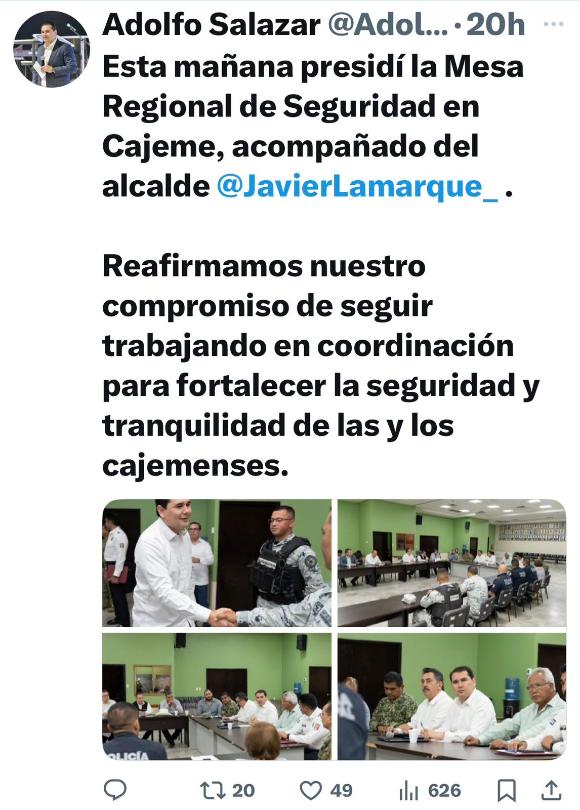 Esto puede deducirse, a partir de la respuesta que dio Lamarque Cano al cebollazo otorgado a su favor por parte del secretario de Gobierno, Adolfo Salazar Razo, encargado de presidir dicha Mesa Regional de Seguridad en Cajeme, al reconocerle su interés en lograr que se pueda seguir avanzando en una agenda de paz para ese municipio.
