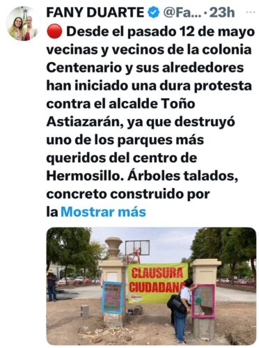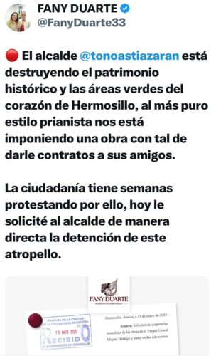 Se trata, pues, de la ya muy bien identificada regidora morenista, (ex furibunda claudillera pavlovichista), Stephanía “la Fany” Duarte Federico, quien ayer ya no pudo controlar sus ansias de protagonismo, desplazando al presunto activista ambiental, Isabel “el Chabelo” Dorado Auz de la encomienda que le había asignado, y asumiendo ella personalmente este nuevo intento por descalificar todas las obras que emprenda el Ayuntamiento de Hermosillo que preside Antonio Astiazarán Gutiérrez.