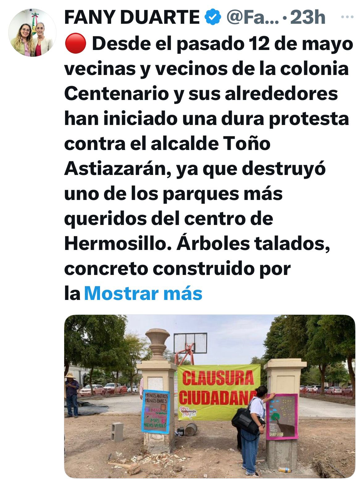 El punto es, que la susodicha tuvo la ocurrencia de grabar un mensaje dirigido al pueblo de Hermosillo, y a toooodaasss las fuerzas progresistas del mundo, para que se sumen a la lucha por evitar que en esta capital se sigan cometiendo afectaciones al medio ambiente y hasta a sitios históricos.