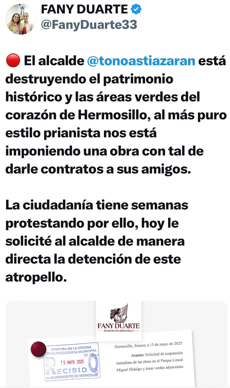 De igual forma en mensajes subidos a su cuenta X, Duarte Federico asegura que dicha obra significa un gasto de 75 millones de pesos, cuando en realidad el costo no superará los 30 millones de pesos, cifras muy dispares que exhiben un interés perverso de alguien que sí sabe que su dato es falso, pues ella es regidora y tiene acceso a esta información.