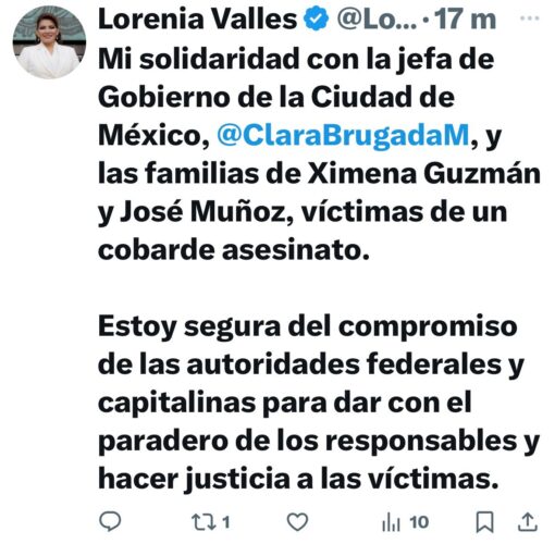 “Mi solidaridad con la jefa de Gobierno de la Ciudad de México, @ClaraBrugadaM, y las familias de Ximena Guzmán y José Muñoz, víctimas de un cobarde asesinato.