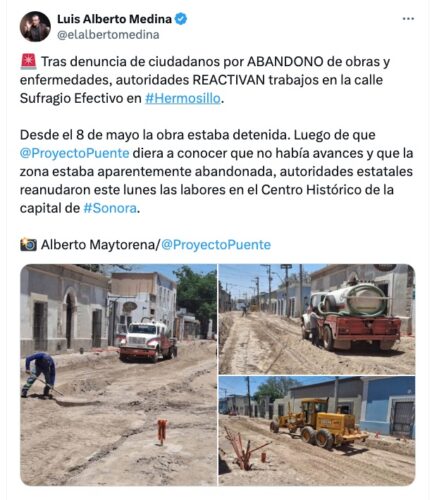 Por otra parte, con una muy buena noticia se levantaron ayer los vecinos del Centro Histórico de Hermosillo que denunciaron la paralización de la obra de rehabilitación de la calle Sufragio Efectivo, entre Mina y el cruce con la No Reelección, en la falda del Cerro de la Campana.