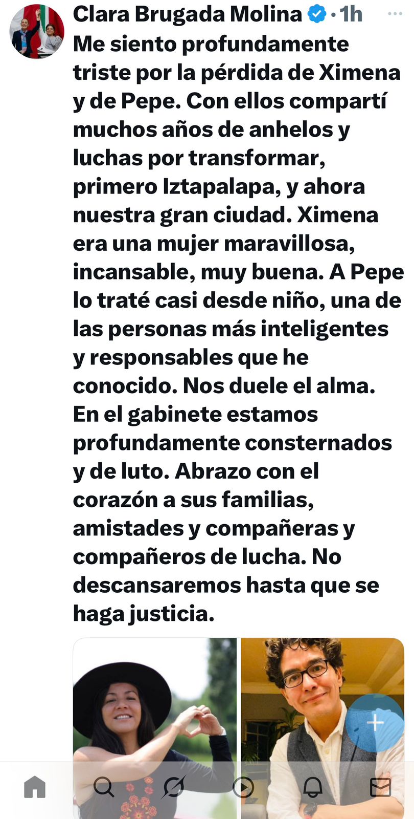 “Mi solidaridad con la jefa de Gobierno de la Ciudad de México, @ClaraBrugadaM, y las familias de Ximena Guzmán y José Muñoz, víctimas de un cobarde asesinato.