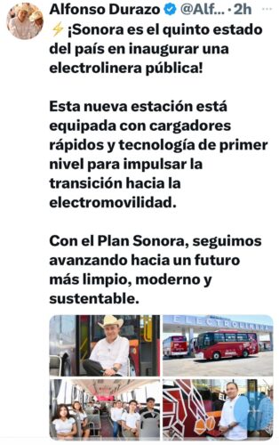 Otro que no cabía ayer de gusto era el gobernador, Alfonso Durazo Montaño al inaugurar la primera electrolinera pública dependiente del Gobierno del Estado, convirtiéndose así en el quinto estado del país en hacerlo.
