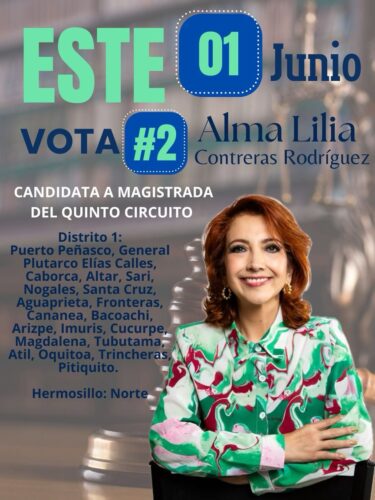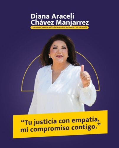 Lo mismo que otras dos damas, Margarita Garzón Munguía, candidata a Jueza Mixta de Distrito, con experiencia también en el ámbito judicial y a quien usted podrá identificar con el número 07 de la boleta Amarilla, así como a Diana Araceli Chávez Manjarrez, candidata a Jueza de Distrito Mixto Sur de Hermosillo Sur de Sonora, quien aparecerá en la boleta Amarilla en la posición número 02.