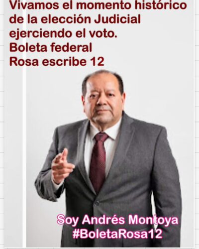 Ni hablar de mi estimado amigo, el licenciado, con grado de Doctor, Andrés Montoya García, aspirante a la Magistratura del Tribunal Colegiado de Apelación del Quinto Circuito, de amplia trayectoria como docente del Derecho y en el servicio público estatal y federal, y a quien usted podrá ubicar en la boleta color Rosa en el número 12.