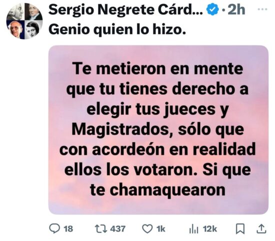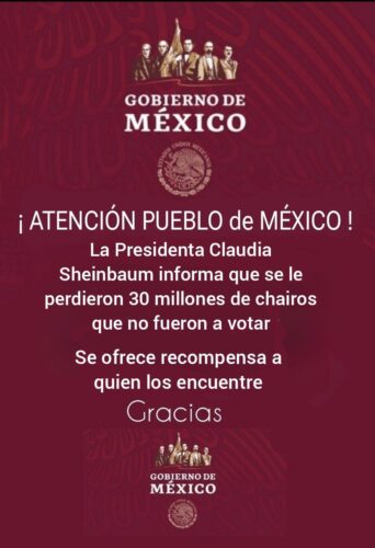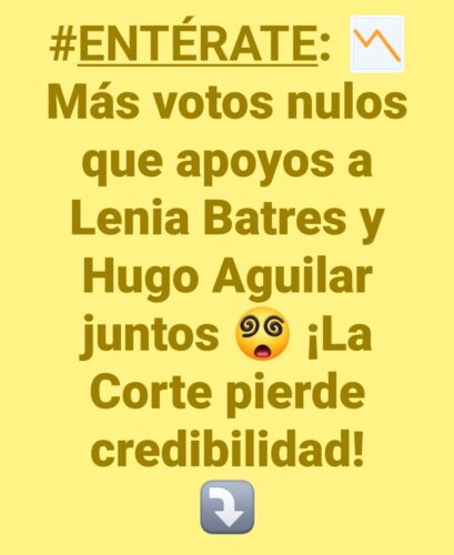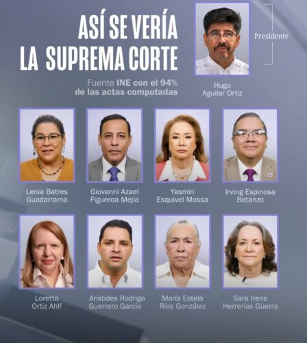 Así pues, y tal como lo marcaban los millones de “acordeones” que se mandaron a hacer para instruir a los votantes por qué personajes votar para el aso de la SCJN, en cuanto a las mujeres lidera el grupo la hdspm, su eminencia Lenia Batres Guadarrama, con el 4.9% de los votos; seguida de Yasmín Esquivel Mossa, Loretta Ortiz Ahlf, María Estela Ríos González y Sara Irene Herrería Guerra, con el 4.4%, 4.2%, 3.9% y 2.6%, respectivamente, mientras en el caso de los varones este listado lo encabeza el ya prácticamente declarado futuro presidente del máximo órgano de justicia en nuestro país, el indígena mixteco Hugo Aguilar Ortiz con su 5.2% de las preferencias de los escasos votos sufragados el pasado domingo, así como Giovanni Azael Figueroa Mexía, Irving Espinosa Betanzos y Arístides Rodrigo Guerrero García, con el 3.0%, 2.9% y 2.8%, respectivamente.