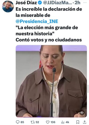 “No hay espacio para dudas ni para manipulaciones. La certeza y la confianza en los resultados es, y seguirá siendo, nuestra principal prioridad”, destacó la hermosillense, ya despojada de todo ápice de vergüenza al referirse al resultado obtenido luego de la farsa electoral del pasado domingo para dizque renovar el Poder Judicial.