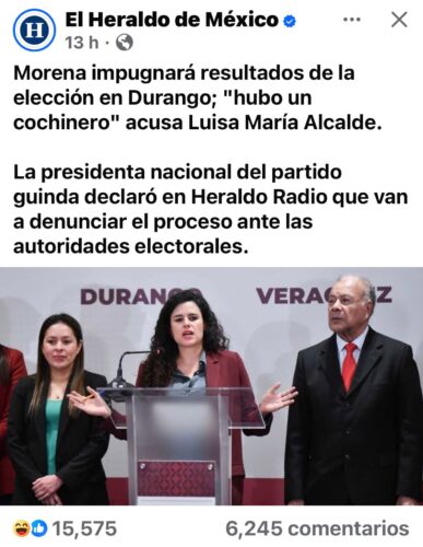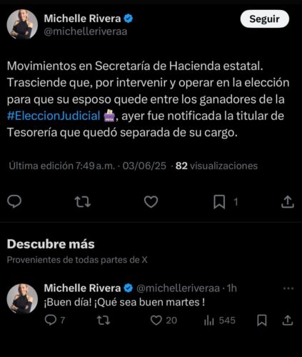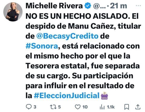 De esto me enteré por medio de un X subido a su cuenta por la colega y amiga, Michelle Rivera Arvayo, mencionando la posibilidad de que esta también abrupta salida del Mesón del Duracismo, tenga relación con lo sucedido a la hoy ex Tesorera Estatal y el ex candidato a magistrado ganador.