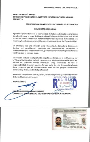 Ahora bien, es importantísimo hacer mención que la carta de renuncia a la candidatura a magistrado, por parte de Acedo Fimbres, fue presentada y sellada de recibida ante la Oficialía de Partes del Instituto Estatal Electoral y de Participación Ciudadana (IEEyPC) a las 07:15 horas del domingo 1 de junio, sí, apenas unos minutos antes de que iniciará oficialmente la jornada electoral, lo cual significa que la bomba tronó desde la tarde o la noche del sábado, y de ahí que, a primera hora del domingo fuera presentada dicha carta de dimisión a la candidatura, y que ésta ya era esperada por el presidente del organismo, Nery Ruiz Arvizu, pues habría sido éste quien dio la instrucción de que a esa hora de la mañana del domingo hubiera ya una persona para recibir el documento en la ventanilla de la Oficialía de Partes.