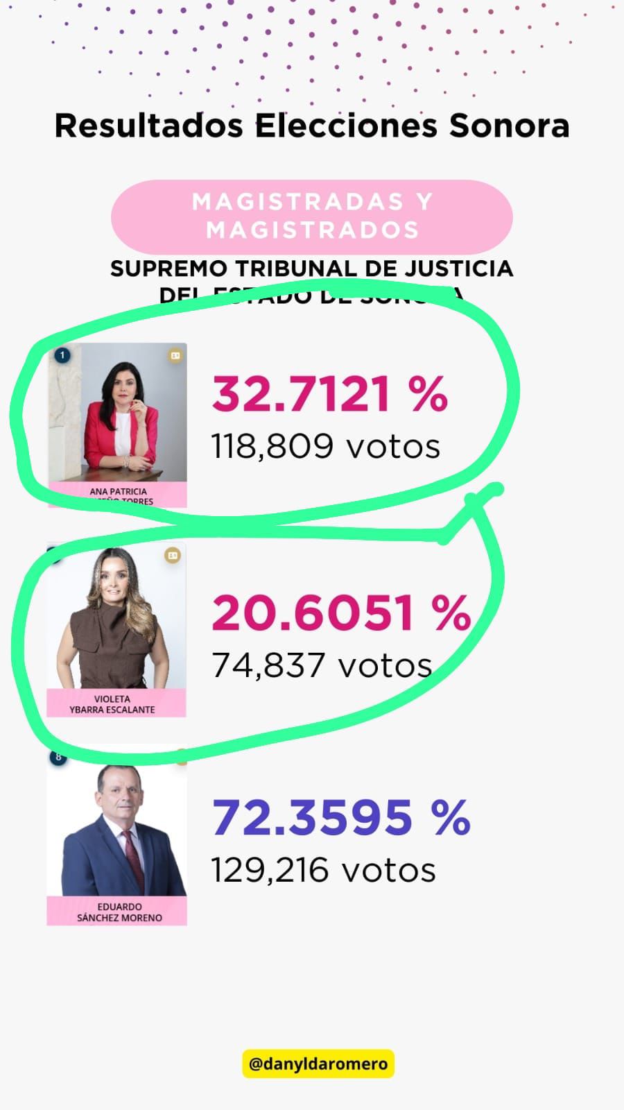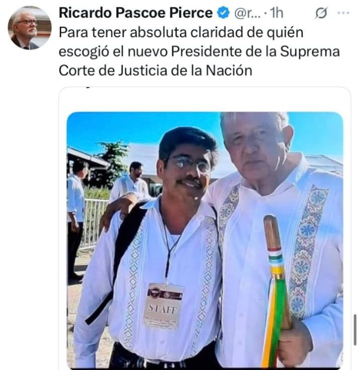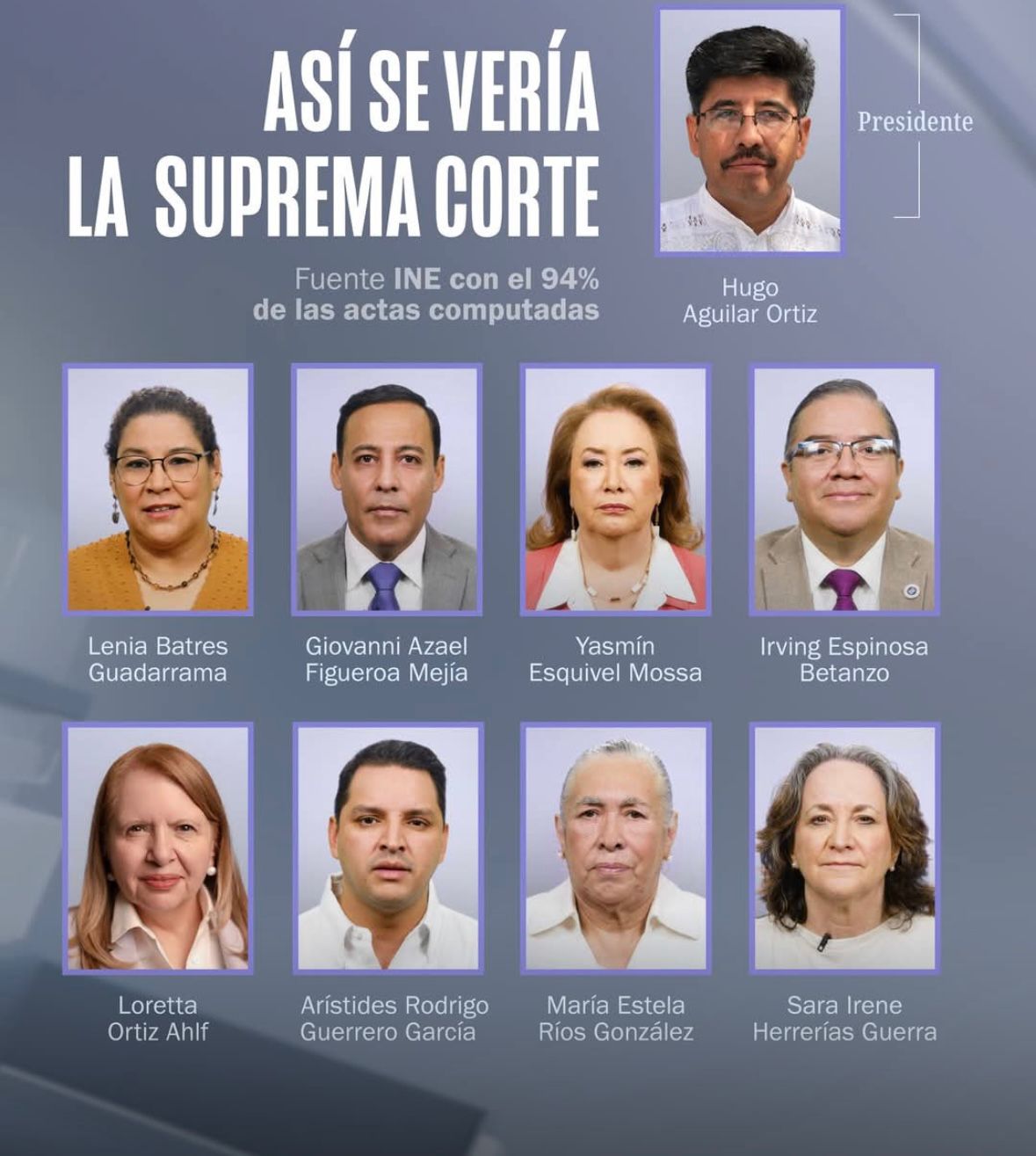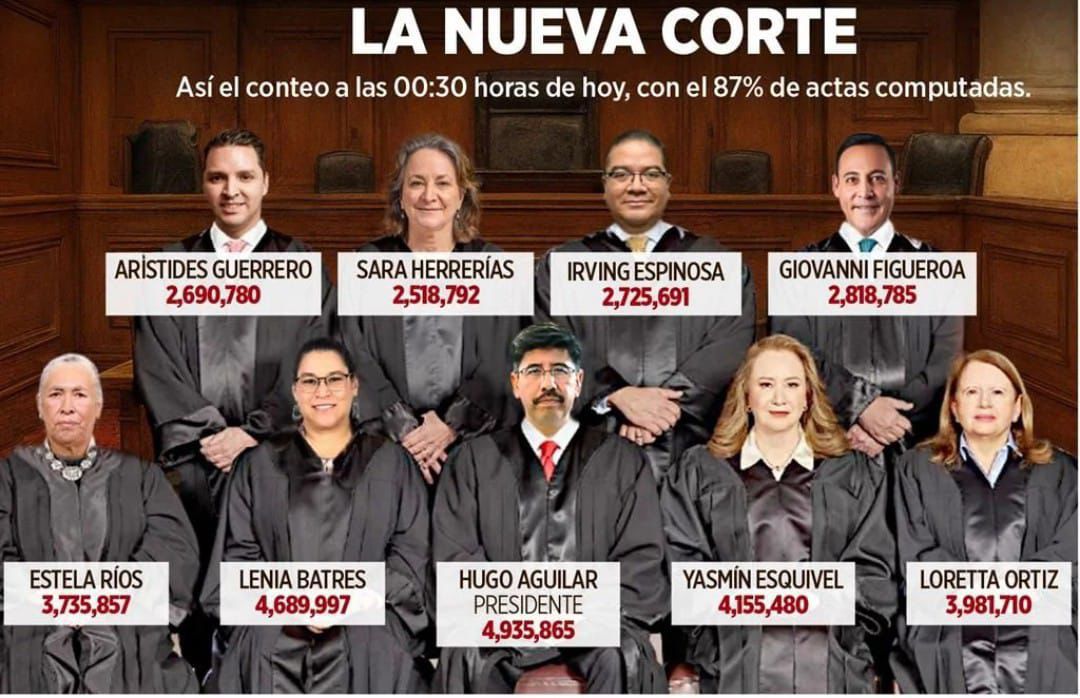 Así pues, y tal como lo marcaban los millones de “acordeones” que se mandaron a hacer para instruir a los votantes por qué personajes votar para el aso de la SCJN, en cuanto a las mujeres lidera el grupo la hdspm, su eminencia Lenia Batres Guadarrama, con el 4.9% de los votos; seguida de Yasmín Esquivel Mossa, Loretta Ortiz Ahlf, María Estela Ríos González y Sara Irene Herrería Guerra, con el 4.4%, 4.2%, 3.9% y 2.6%, respectivamente, mientras en el caso de los varones este listado lo encabeza el ya prácticamente declarado futuro presidente del máximo órgano de justicia en nuestro país, el indígena mixteco Hugo Aguilar Ortiz con su 5.2% de las preferencias de los escasos votos sufragados el pasado domingo, así como Giovanni Azael Figueroa Mexía, Irving Espinosa Betanzos y Arístides Rodrigo Guerrero García, con el 3.0%, 2.9% y 2.8%, respectivamente.