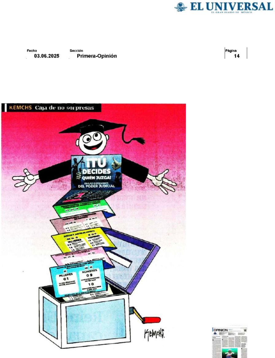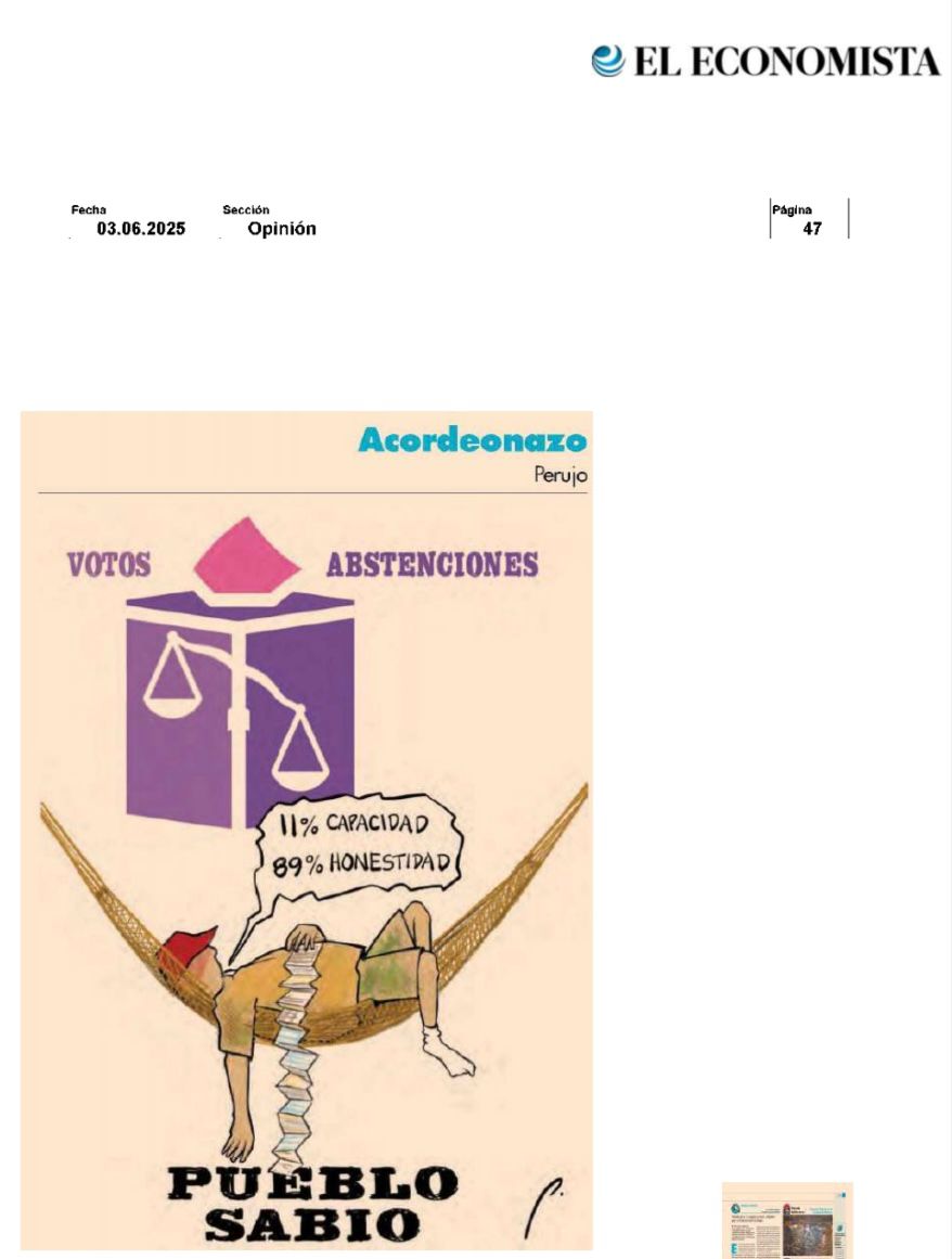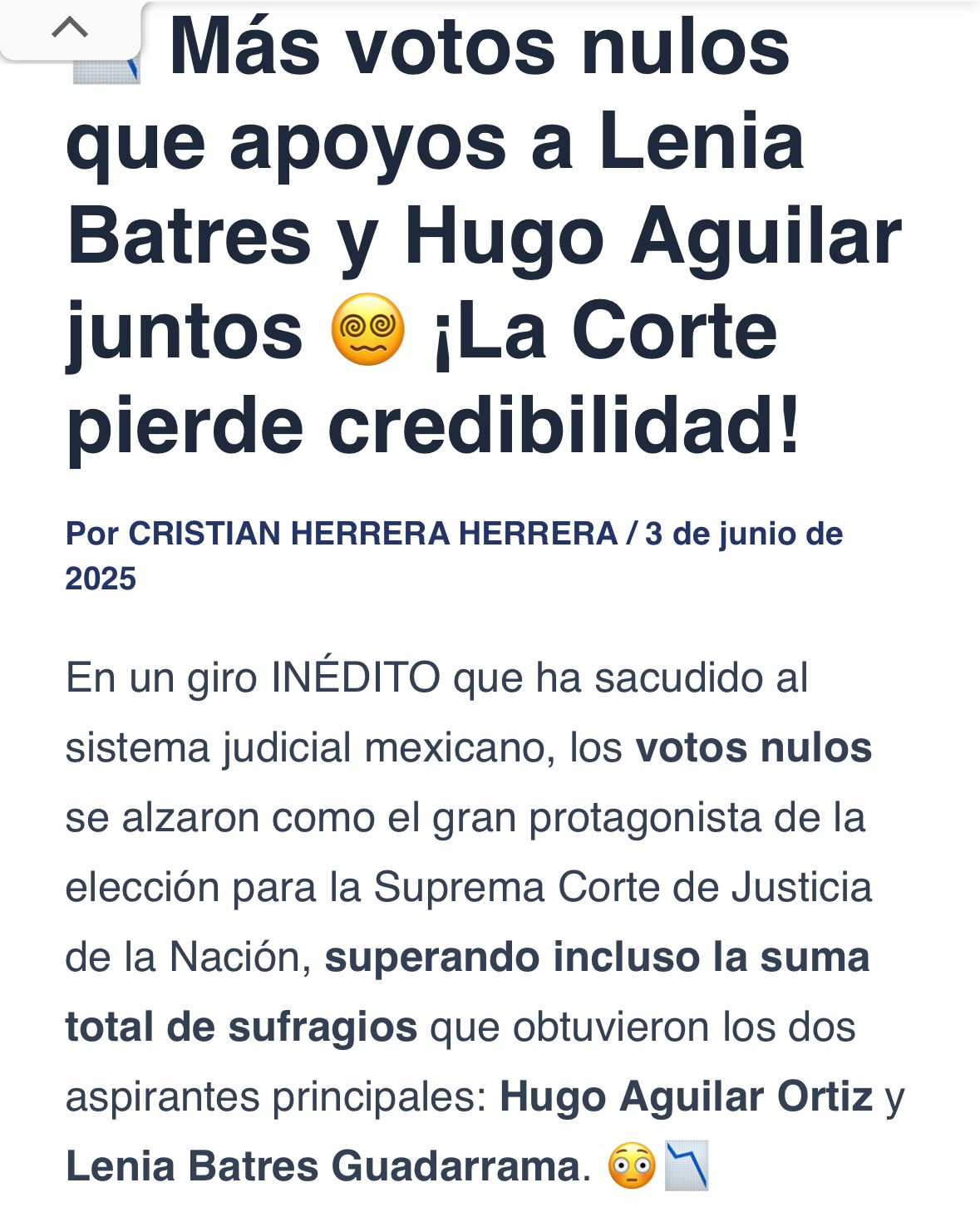 Así pues, y tal como lo marcaban los millones de “acordeones” que se mandaron a hacer para instruir a los votantes por qué personajes votar para el aso de la SCJN, en cuanto a las mujeres lidera el grupo la hdspm, su eminencia Lenia Batres Guadarrama, con el 4.9% de los votos; seguida de Yasmín Esquivel Mossa, Loretta Ortiz Ahlf, María Estela Ríos González y Sara Irene Herrería Guerra, con el 4.4%, 4.2%, 3.9% y 2.6%, respectivamente, mientras en el caso de los varones este listado lo encabeza el ya prácticamente declarado futuro presidente del máximo órgano de justicia en nuestro país, el indígena mixteco Hugo Aguilar Ortiz con su 5.2% de las preferencias de los escasos votos sufragados el pasado domingo, así como Giovanni Azael Figueroa Mexía, Irving Espinosa Betanzos y Arístides Rodrigo Guerrero García, con el 3.0%, 2.9% y 2.8%, respectivamente.