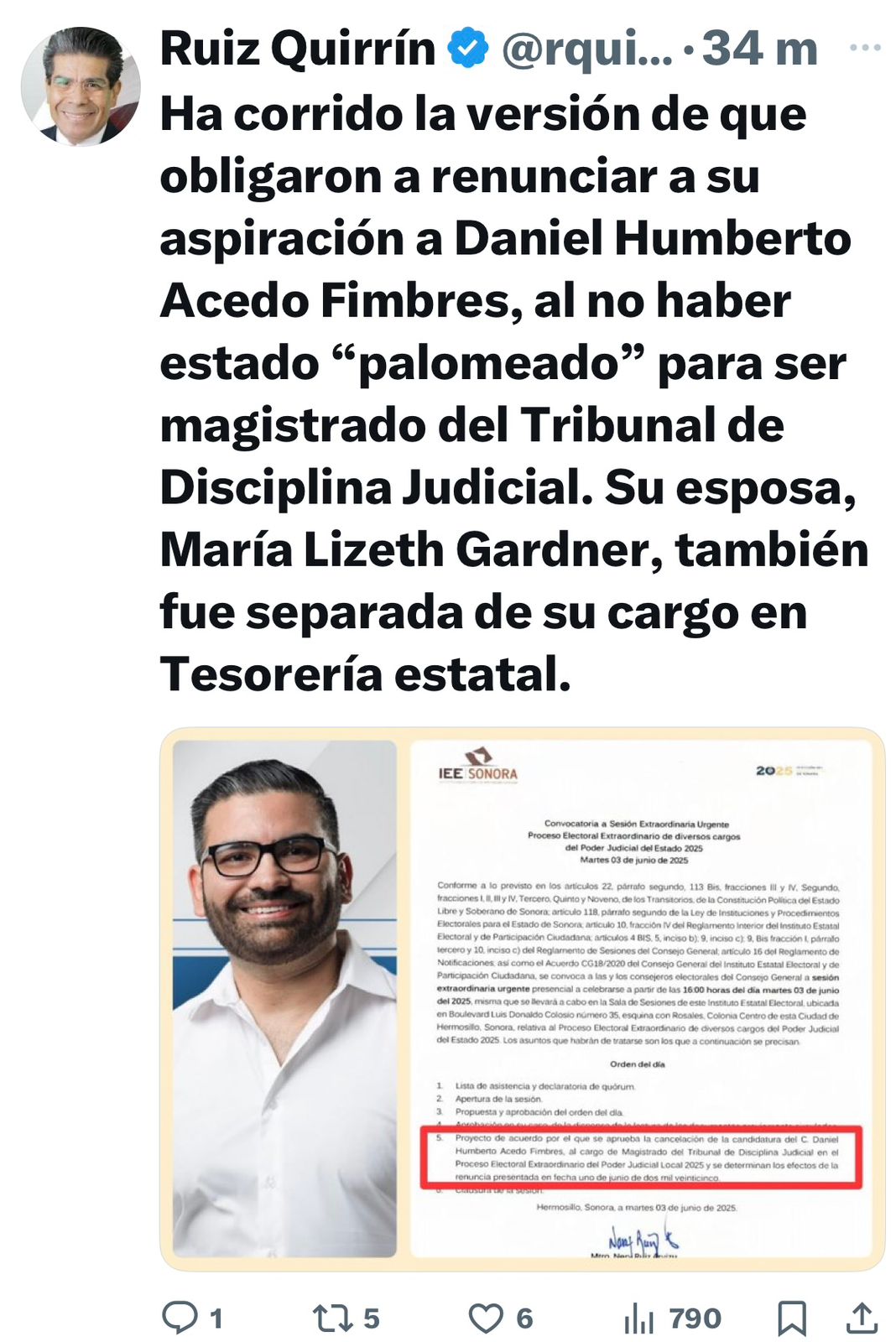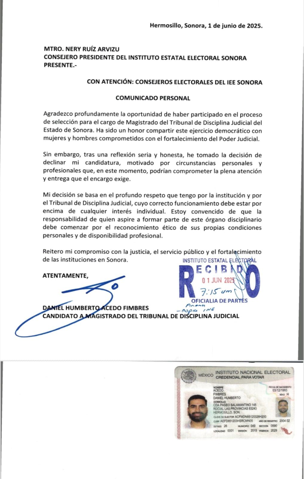 Ahora bien, es importantísimo hacer mención que la carta de renuncia a la candidatura a magistrado, por parte de Acedo Fimbres, fue presentada y sellada de recibida ante la Oficialía de Partes del Instituto Estatal Electoral y de Participación Ciudadana (IEEyPC) a las 07:15 horas del domingo 1 de junio, sí, apenas unos minutos antes de que iniciará oficialmente la jornada electoral, lo cual significa que la bomba tronó desde la tarde o la noche del sábado, y de ahí que, a primera hora del domingo fuera presentada dicha carta de dimisión a la candidatura, y que ésta ya era esperada por el presidente del organismo, Nery Ruiz Arvizu, pues habría sido éste quien dio la instrucción de que a esa hora de la mañana del domingo hubiera ya una persona para recibir el documento en la ventanilla de la Oficialía de Partes.