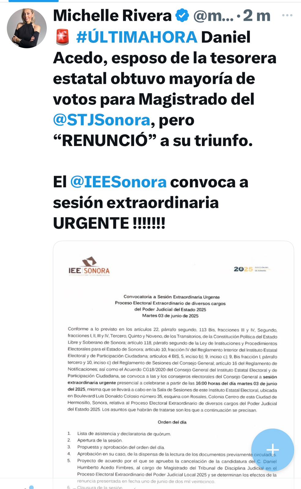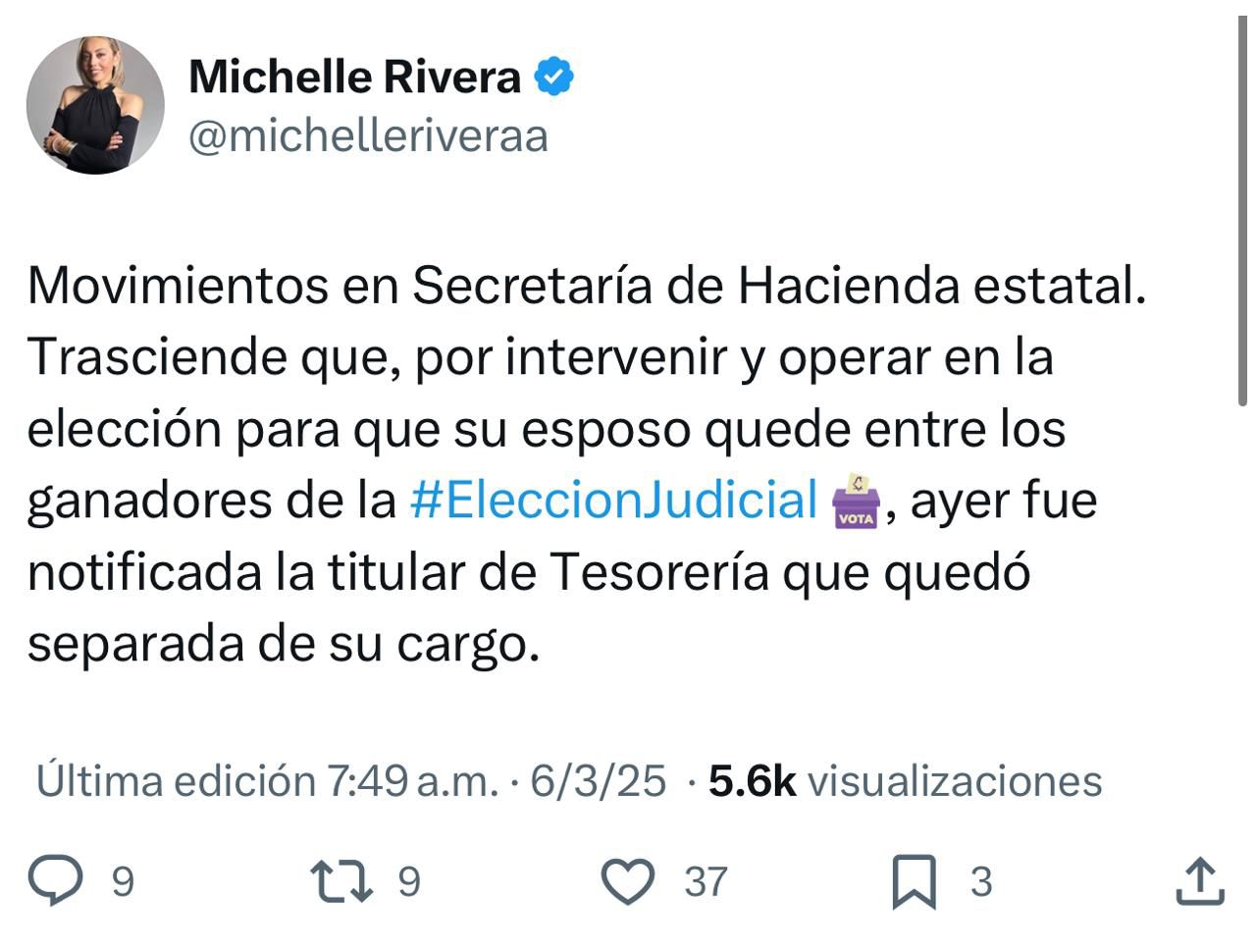 De esto me enteré por medio de un X subido a su cuenta por la colega y amiga, Michelle Rivera Arvayo, mencionando la posibilidad de que esta también abrupta salida del Mesón del Duracismo, tenga relación con lo sucedido a la hoy ex Tesorera Estatal y el ex candidato a magistrado ganador.