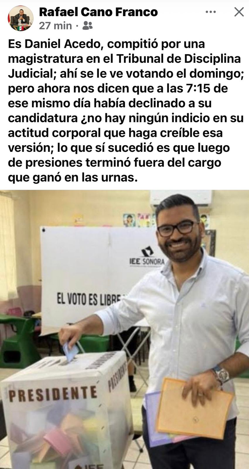 Al final el único colgado de la brocha fue Daniel Humberto Acedo Fimbres, quien “renunció” a su candidatura y elección por abrumadora mayoría como magistrado del Tribunal de Disciplina Jurídica (TDJ) del Supremo Tribunal de Justicia del Estado, esto bajo el argumento de que su posición podría interpretarse como un conflicto de intereses al ser esposo de María Lizbeth Gardner, algo en lo cual supuestamente cayeron en cuenta ya el mero día de la elección, la mañana del pasado domingo.