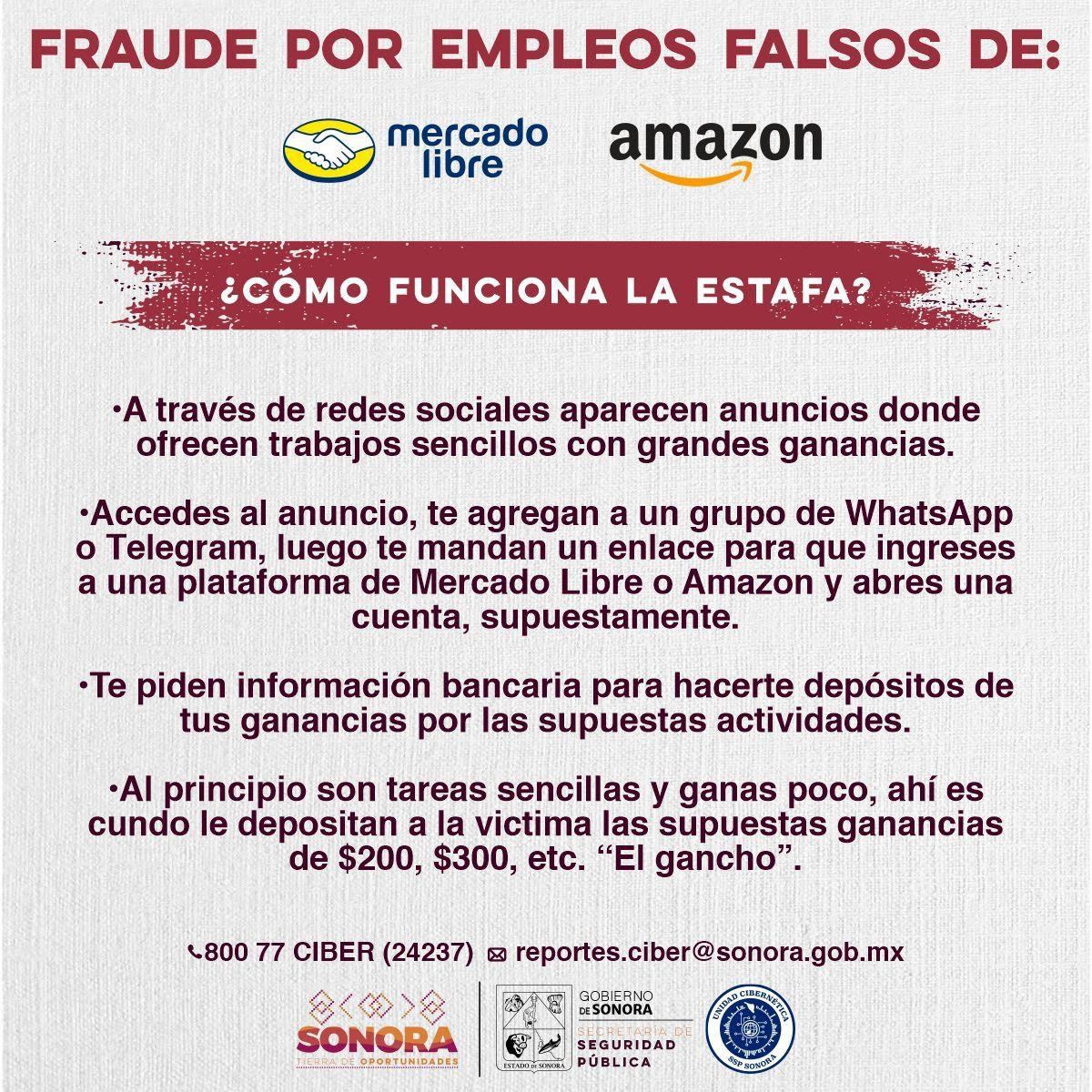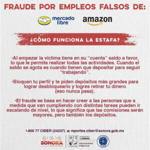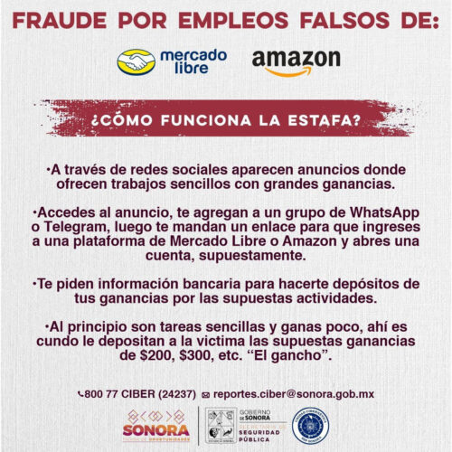 Comprometidos con la seguridad de las y los sonorenses, personal especializado de la Unidad detectó el modo de operación de ciberdelincuentes, que inicia agregando a personas a grupos de WhatsApp o Telegram y, posteriormente, envían un enlace para ingresar a una supuesta plataforma de Amazon o Mercado Libre y abrir una cuenta falsa.