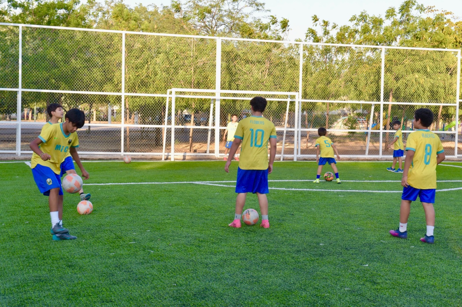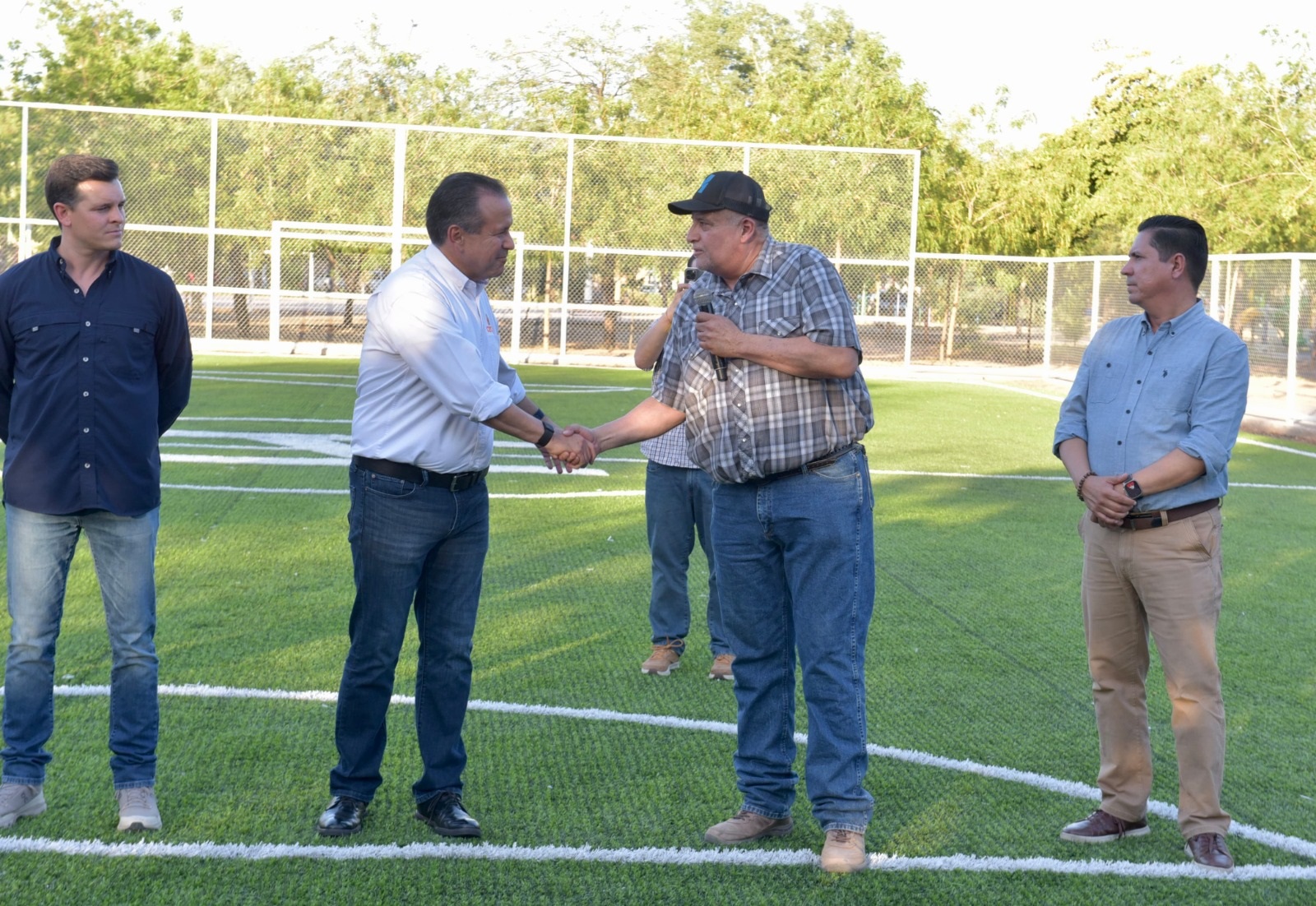 Hermosillo, Sonora; 18 de junio, 2025. Como parte de las acciones del Municipio para ofrecer mejores espacios deportivos, el presidente municipal de Hermosillo, Antonio Astiazarán Gutiérrez entregó a vecinas y vecinos del fraccionamiento Villas del Mediterráneo la rehabilitación del campo de fútbol de la zona.