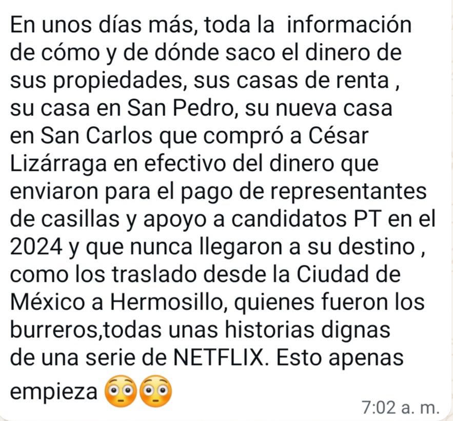 Y desde Nogales me reportan que la diputada morenista por el distrito V de esa frontera, Marcela Valenzuela Nevárez, prefirió disculparse para no asistir a un foro legislativo donde ya la esperaba un grupo de ex trabajadores de la Agencia Aduanal de su propiedad, quienes la tienen demandada ante los tribunales por despidos injustificados y otros abusos.