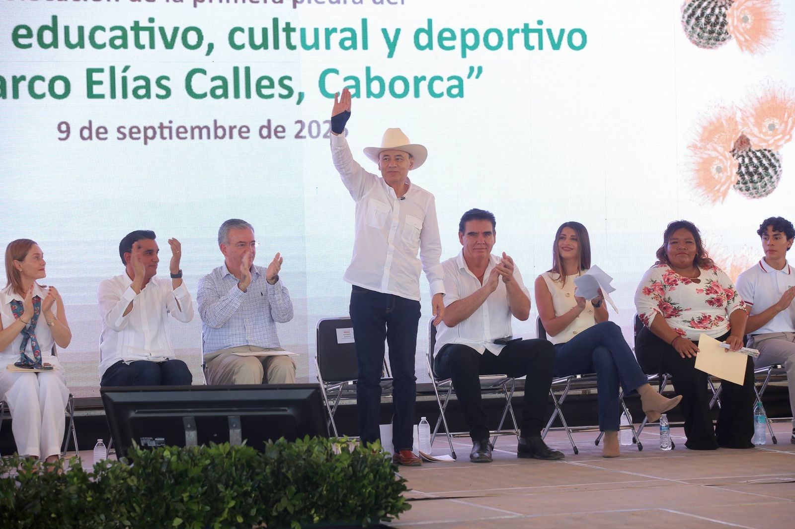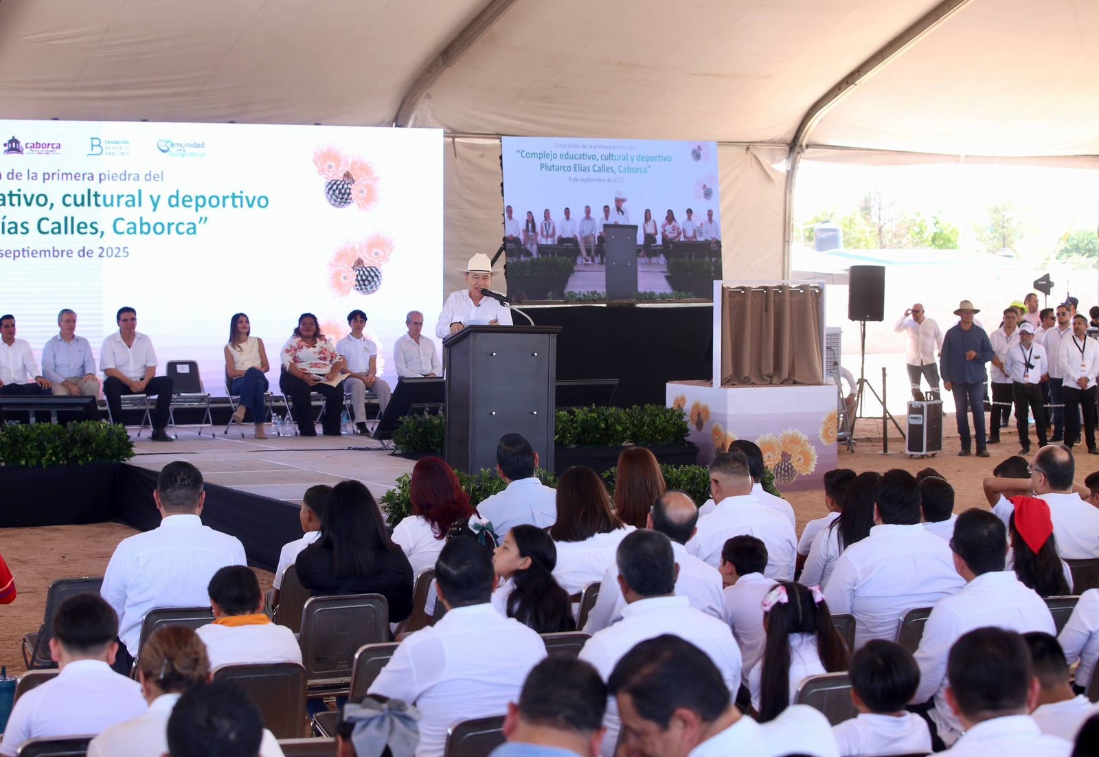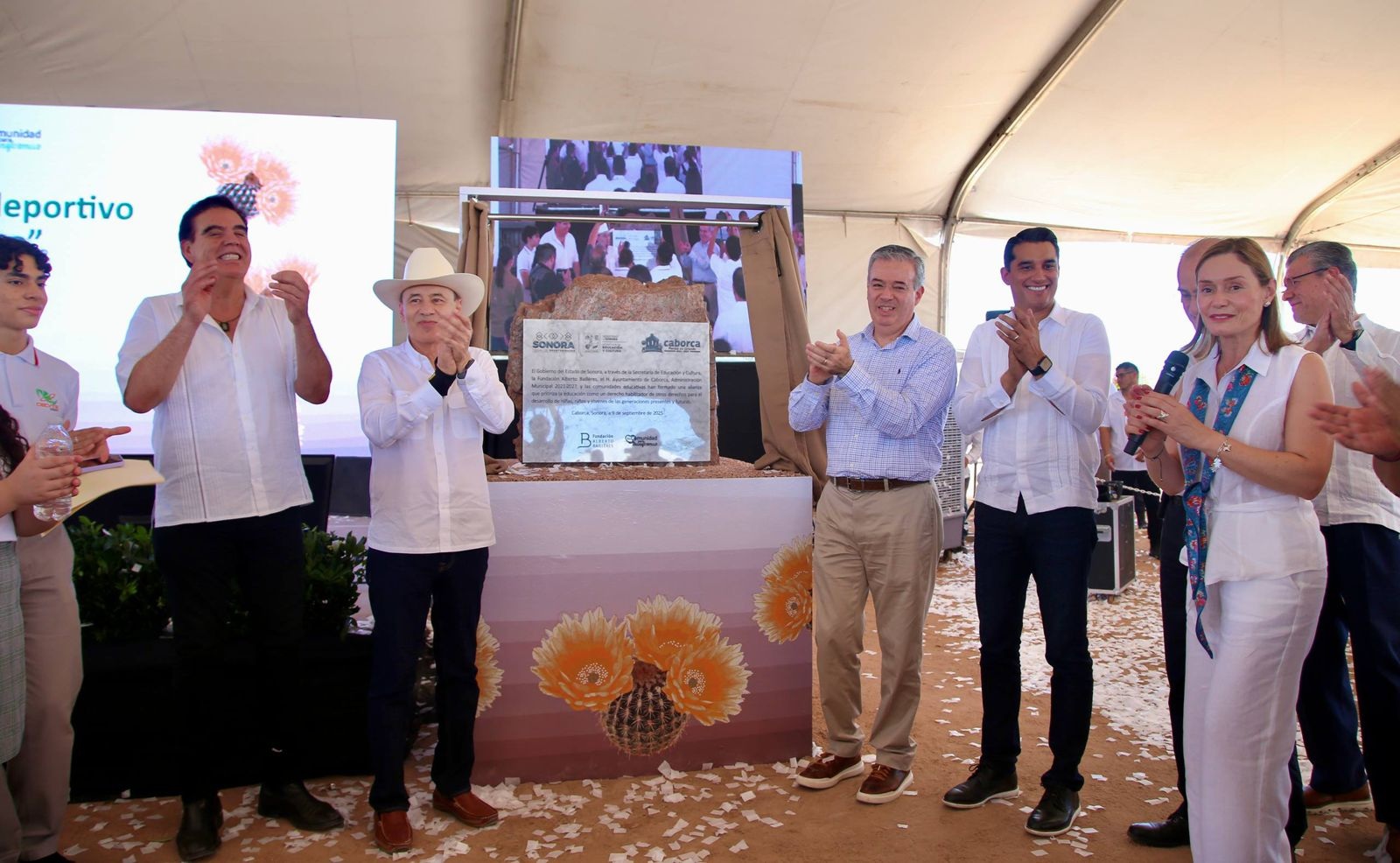 Caborca, Sonora; 9 de septiembre de 2025.- En cumplimiento a su compromiso con las familias caborquenses de continuar la transformación de Sonora desde las aulas, y en beneficio de las y los estudiantes de aquellas comunidades que han vivido en rezago histórico, el gobernador Alfonso Durazo Montaño, en alianza con la Fundación Alberto Baillères, colocó la primera piedra del Hábitat Educativo, ubicado en la comunidad rural de la Y Griega, en el municipio de Caborca.