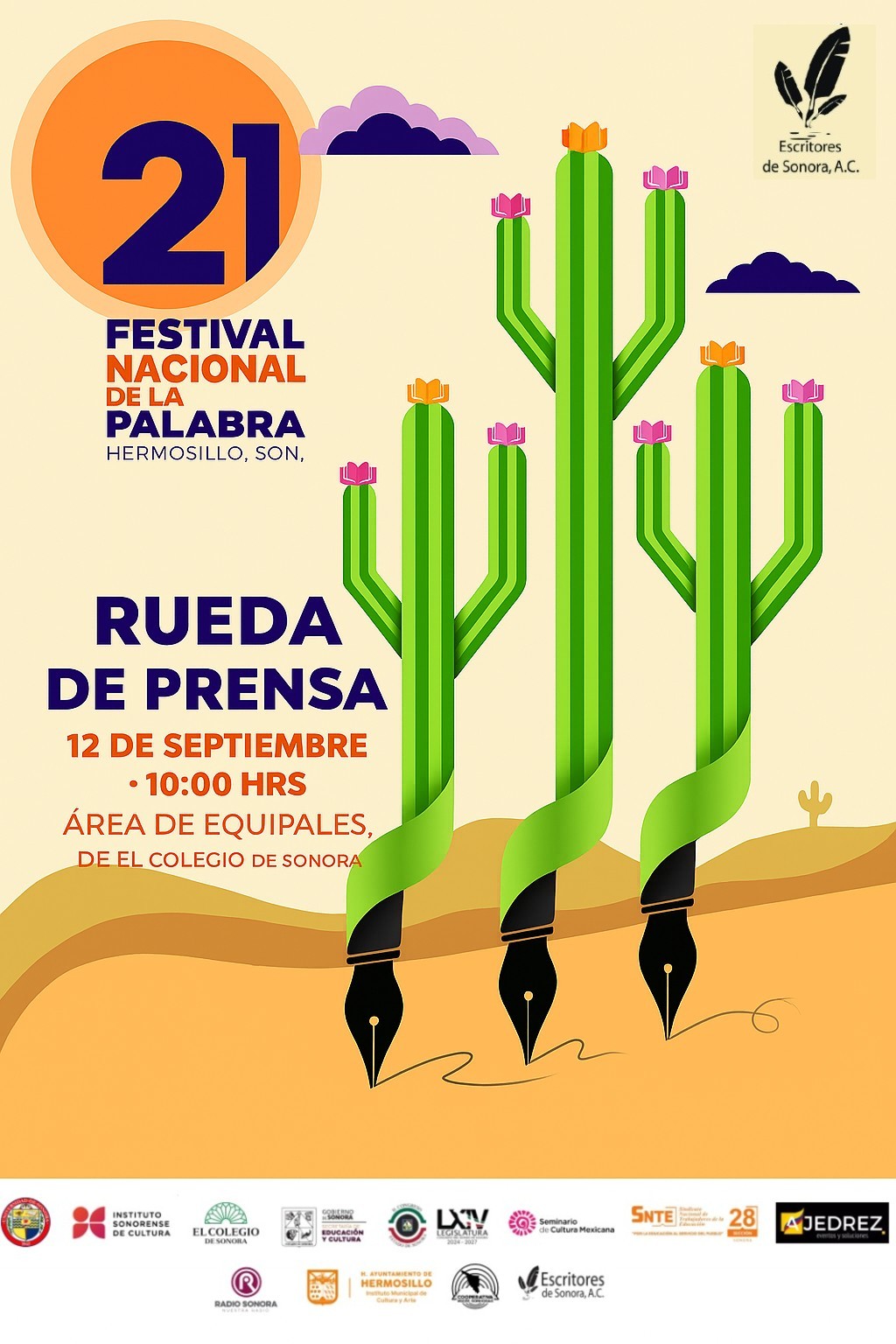 Estimadas y estimados representantes de los medios de comunicación, El Colegio de Sonora en coordinación con Escritores de Sonora A.C. convoca a rueda de prensa con motivo del 21º Festival de la Palabra: Encuentro de los que escriben con los que leen, espacio que busca fomentar el diálogo entre escritores, lectores y la comunidad en torno a la literatura y la palabra.