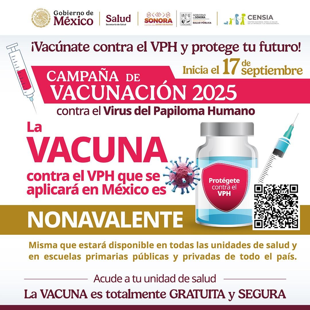 Hermosillo, Sonora; 15 de septiembre de 2025.- El Gobierno de Sonora, a través de la Secretaría de Salud Pública (SSP), informa a la población sobre el inicio de la Campaña de Vacunación contra el Virus del Papiloma Humano (VPH) 2025, que se llevará a cabo del 17 de septiembre al 19 de diciembre del presente año en los 72 municipios del estado.