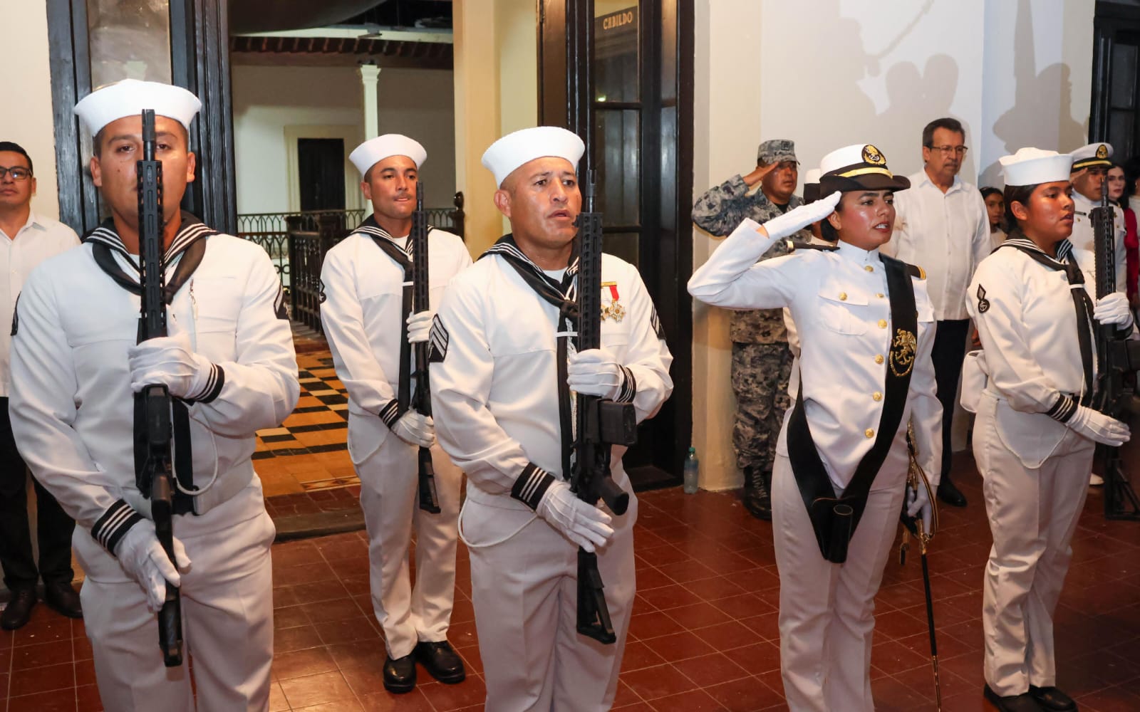 El acto inició con la participación de la Escolta de Bandera y la Banda de Guerra de la Segunda Región Naval, que partieron desde el centro de la Plaza de los Tres Presidentes y se dirigieron al Palacio Municipal para rendir los honores a la bandera.