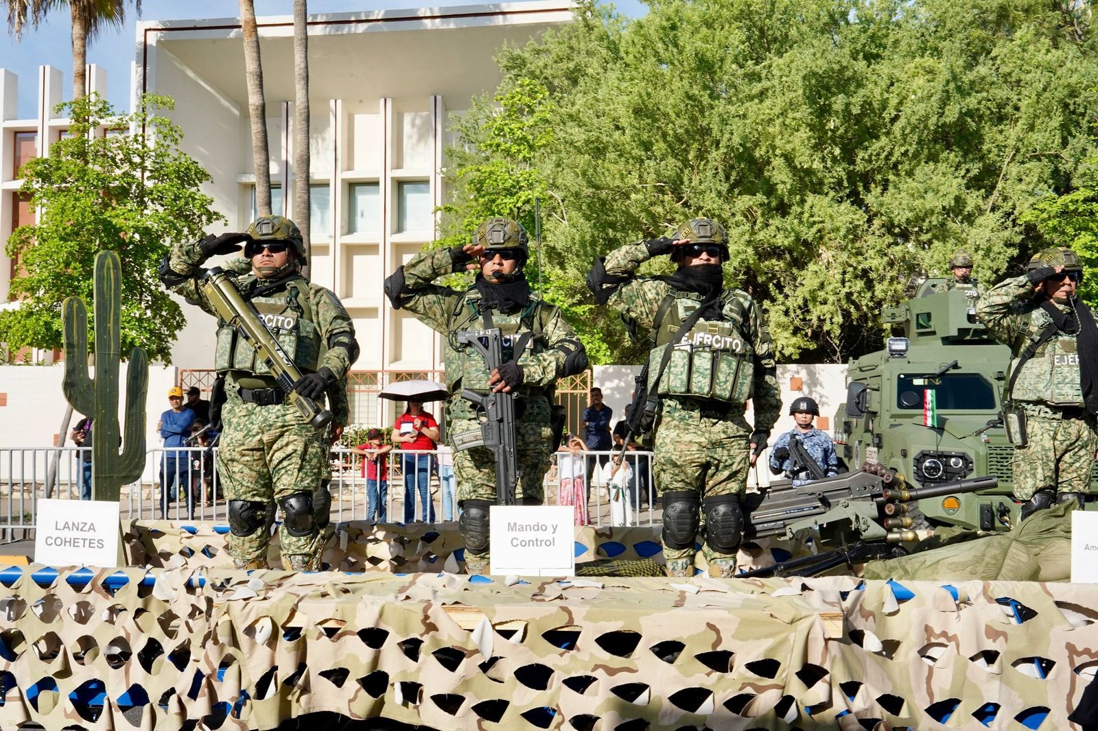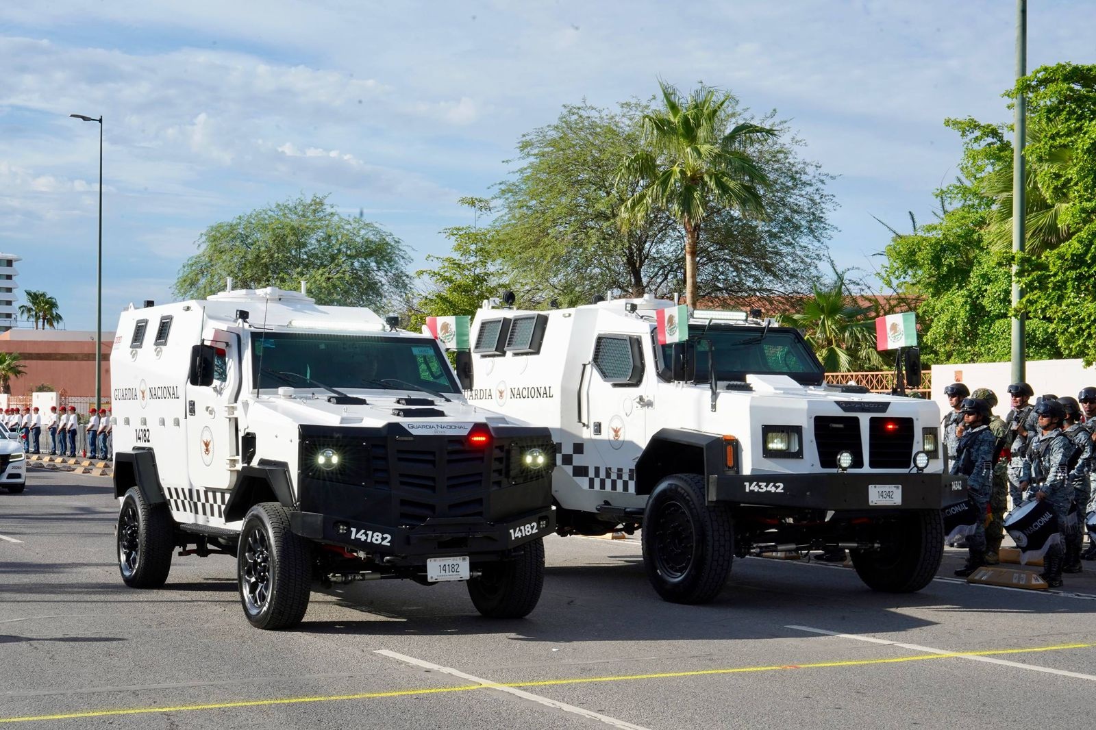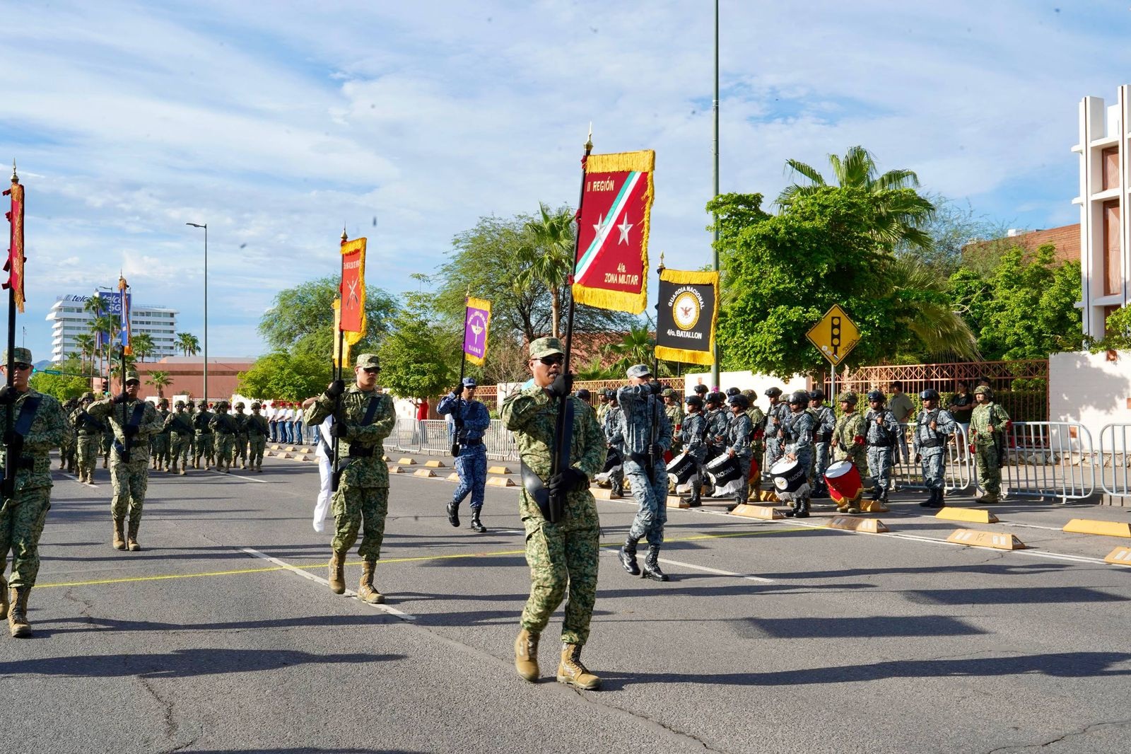 Desfilaron ante el pueblo sonorense una bandera monumental, seis bandas de guerra, seis banderines, 300 elementos del Ejército Mexicano, 155 integrantes de la Guardia Nacional, 64 militares de la Fuerza Aérea, 122 integrantes de la Secretaría de Guerra y Marina, 112 soldados del Servicio Militar Nacional, 65 integrantes de corporaciones de Seguridad Pública Estatal y Municipal, 565 alumnos de planteles educativos, 15 integrantes de Bomberos de Hermosillo,15 de Cruz Roja Mexicana, 25 de rescate juvenil, 50 del pentatlón de Sonora, 75 vehículos de diferentes corporaciones, cinco motocicletas, y 10 binomios canófilos.
