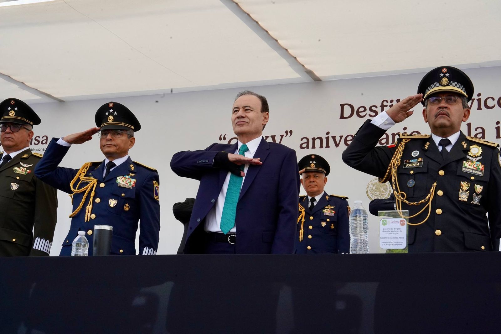 Hermosillo, Sonora; 16 de septiembre de 2025.- Ante cientos de familias que acudieron para disfrutar del tradicional espectáculo del desfile cívico militar, por la celebración para conmemorar el 215 aniversario de la Independencia de México, el gobernador Alfonso Durazo Montaño encabezó la ceremonia que contó con la participación de mil 488 personas y el despliegue de 79 unidades automotores.