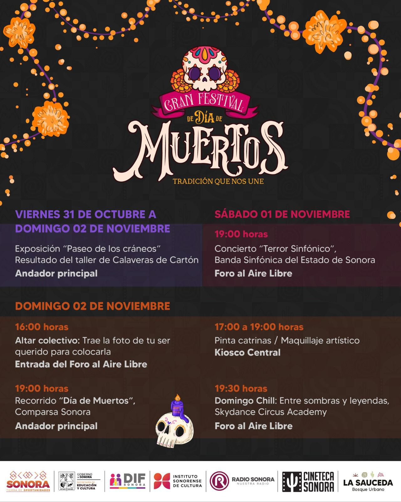 Para el sábado 1 de noviembre está previsto el Concierto del Terror Sinfónico, a cargo de la Banda Sinfónica del Estado de Sonora y una exposición de calaveras de cartón en el Bosque Urbano La Sauceda desde las siete de la tarde, para continuar al día siguiente, en el mismo sitio, con altares colectivos, pinta de catrinas, entre otras amenidades, en tanto que para el martes 4 de noviembre y por rumbos de Villa de Chirris, conocida también como Villa de Seris, será la procesión del Día de Muertos desde ese barrio mágico hasta la Casa de la Cultura con un colorido programa artístico.