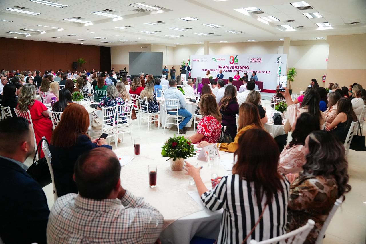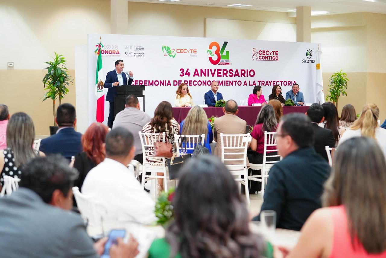 Hermosillo, Sonora; 20 de octubre de 2025.- El Gobierno de Sonora, a través del Colegio de Estudios Científicos y Tecnológicos del Estado de Sonora (Cecyte) conmemoró el 34 aniversario del subsistema con una ceremonia en la que reconoció la trayectoria de docentes y personal de servicio por sus años de dedicación, esfuerzo y compromiso con la educación de las y los jóvenes sonorenses.