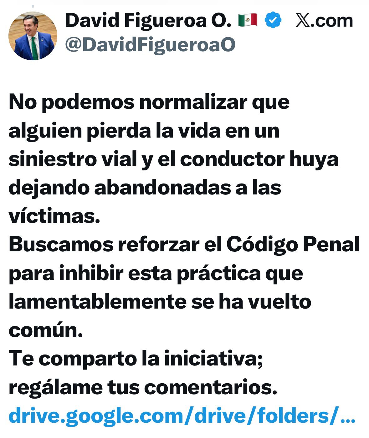 “No podemos normalizar que alguien pierda la vida en un siniestro vial y el conductor huya dejando abandonadas a las víctimas. Buscamos reforzar el Código Penal para inhibir esta práctica que lamentablemente se ha vuelto común. Te comparto la iniciativa; regálame tus comentarios”.