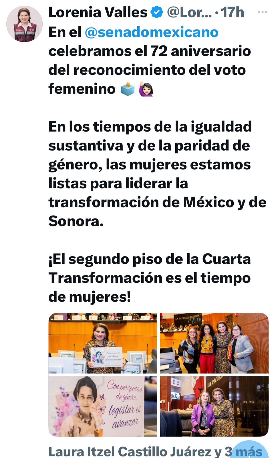 Ayer, por ejemplo, leí un mensaje subido a su cuenta X por la senadora morenista, Lorenia Iveth Valles Sampedro, donde luego de congratularse por el 72 aniversario del reconocimiento al voto femenino en nuestro país, suelta una arenga en el sentido de que las mujeres están listas para liderar la transformación de México y de Sonora.